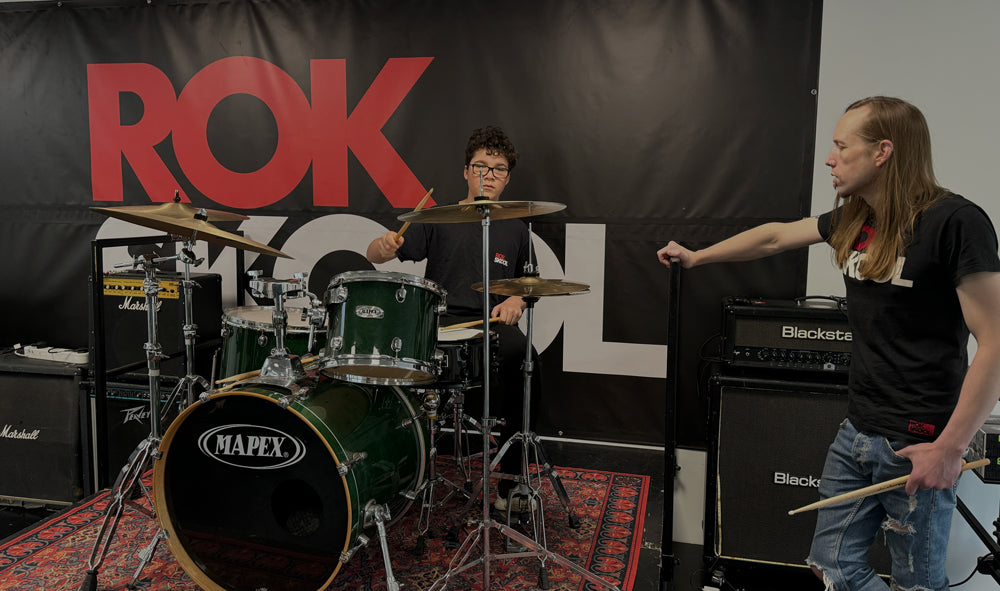 Let's goBefore a drum kit takes up half your house, come to us and we’ll put you behind a kit and help develop a sense of rhythm with a sets of drum exercises and associated songs. Once you advance you will have the opportunity to join a Rok Skool Band.